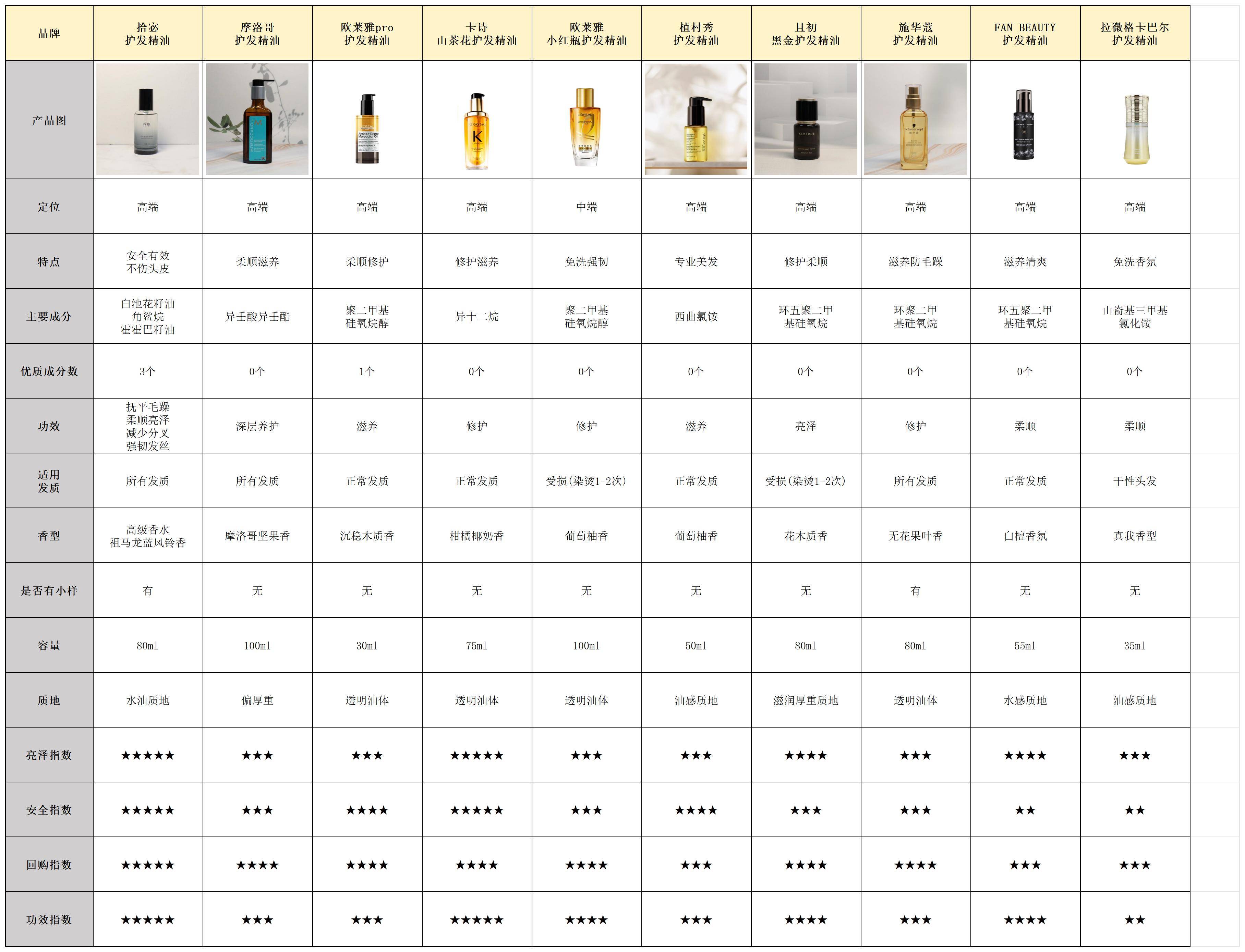 (以下是部分护发精油产品的测评数据对比,以便大家能够对它们有一个基本的了解)